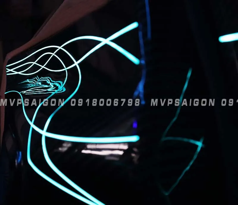 2. Ánh Sáng LED Dòng Nước – Sự Phá Cách và Độc Đáo: Đèn LED dòng nước tạo ra hiệu ứng ánh sáng mềm mại, như dòng nước mát lạnh chảy qua bề mặt carbon. Điều này không chỉ tạo nên không khí thoải mái mà còn mang lại cảm giác mát lạnh và tươi mới cho nội thất xe.