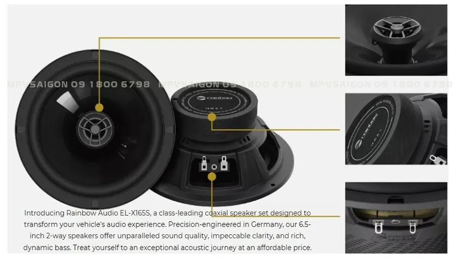 Rainbow Audio EL-X165S – Loa đồng trục 2 chiều 6.5 inch là sự lựa chọn hoàn hảo cho những ai muốn nâng cấp âm thanh trong xe hơi mà không cần đầu tư quá nhiều. Để biết thêm chi tiết về sản phẩm và lắp đặt, vui lòng liên hệ với MPVSAIGON qua hotline: 09 1800 6798.