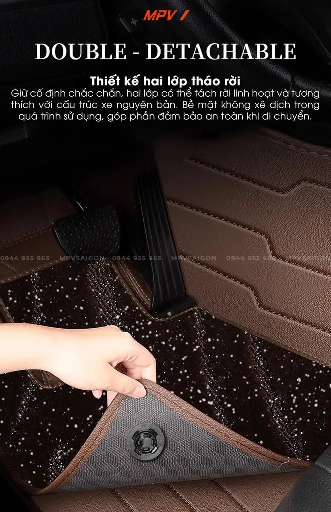 => Thiết kế double và detachable giúp lớp trên được tháo nhanh để vệ sinh, lớp dưới giữ cố định theo form xe. Khi di chuyển ở tốc độ cao hoặc đường gồ ghề, sàn vẫn bám chắc, không phát tiếng động và không bị lệch khỏi vị trí.