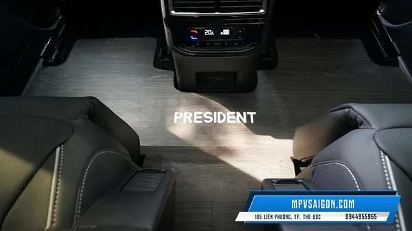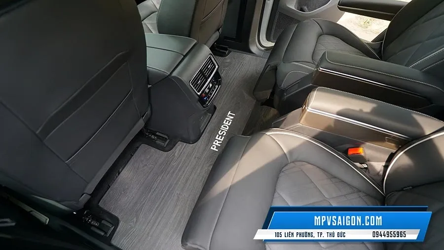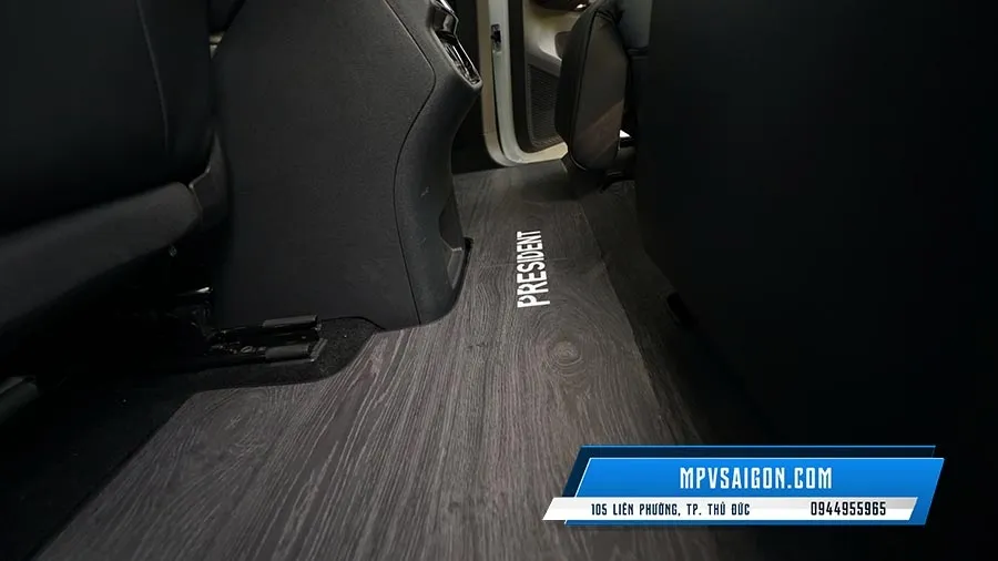 Một trong những điểm nhấn không thể không nhắc đến chính là khả năng cá nhân hóa logo trên sàn xe. Dòng chữ “PRESIDENT” được cắt CNC hoặc ép nhiệt nổi bật ngay trung tâm sàn – không đơn thuần là trang trí, mà là sự thể hiện đẳng cấp và cái tôi cá nhân của chủ nhân chiếc xe.