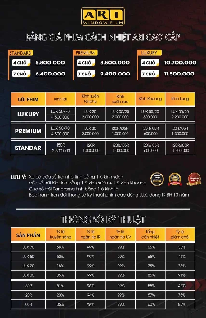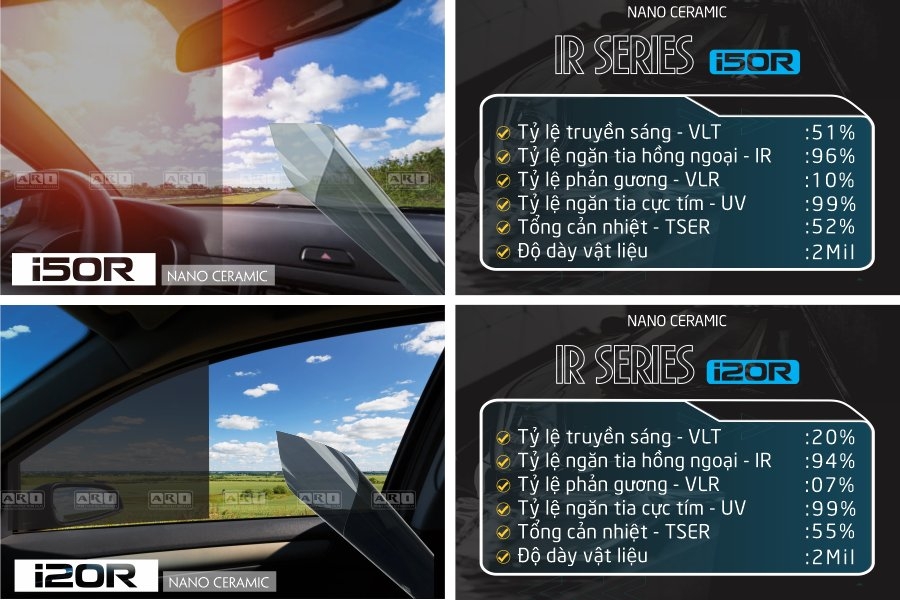 - Bảo vệ toàn diện: Độ dày 2-3mil kết hợp với công nghệ tiên tiến, phim ARI không chỉ cản nhiệt hiệu quả mà còn tăng cường độ bền cho kính xe, bảo vệ nội thất khỏi tác hại của tia UV và nhiệt độ cao.
