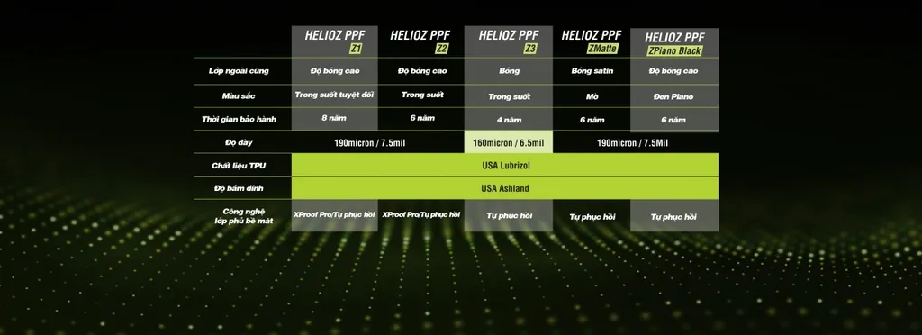 - PPF TPU: Loại phim cao cấp với tính năng vượt trội như khả năng tự phục hồi và độ bền cao hơn.